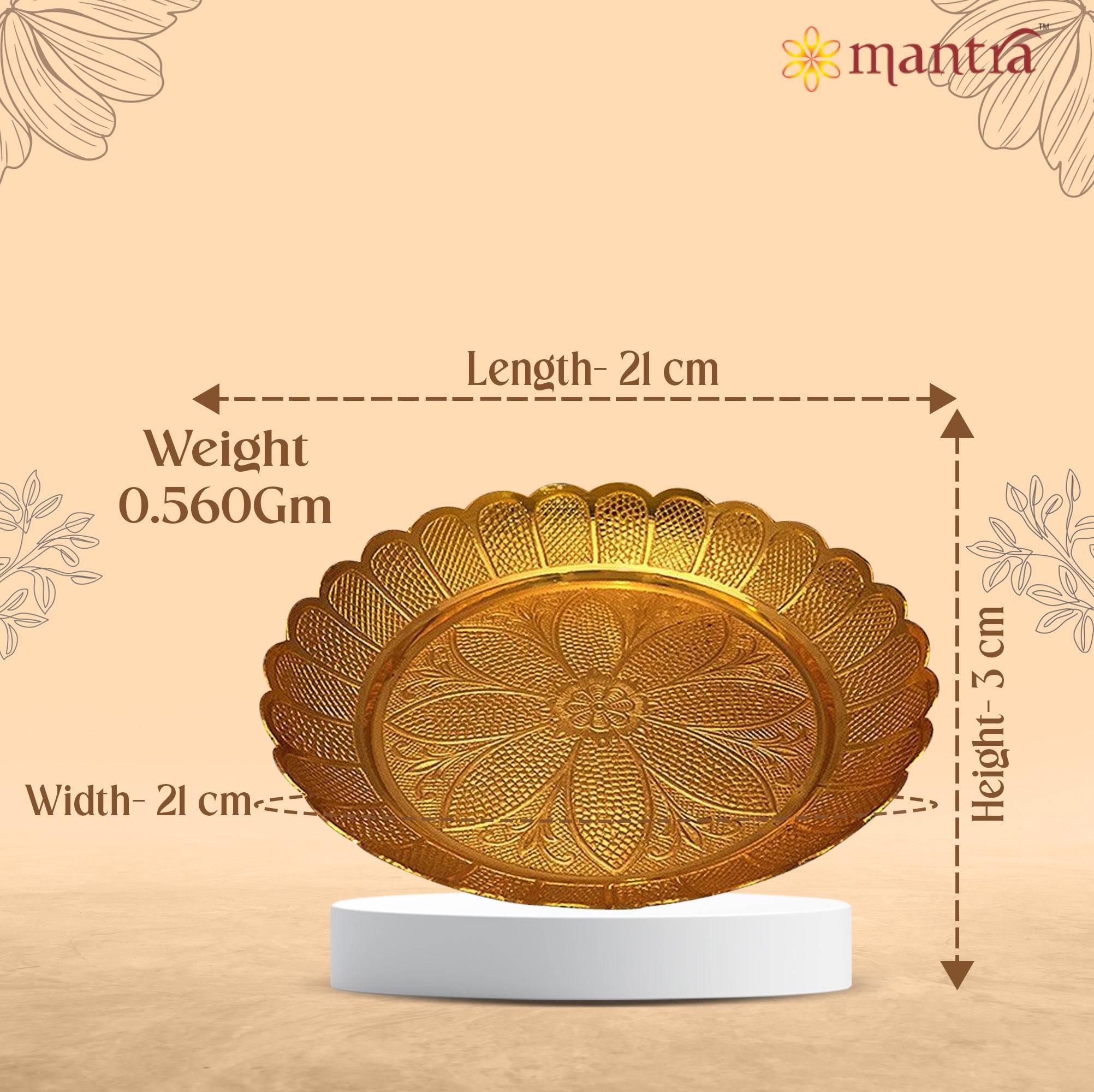 Handcrafted traditional Brass plates with engraved floral motifs. These plates were used as every day vessels by our ancestors, as brass vessels were prevalently in use. But now brass kinardars are used as a decorative piece, or as a puja room accessory. The plate is shallow, with a concave rim designed to mimic flower petals.The mere presence of brass in our space, induces positive vibrations that maintain the energy equilibrium. They are a choice decorative, and functional element in the Puja room to place the Puja articles. Put it to practical use or simply hang it up as a decorative piece on walls or as trays on the table, these Plate kinardars are sure to alter the forces around us favourably.