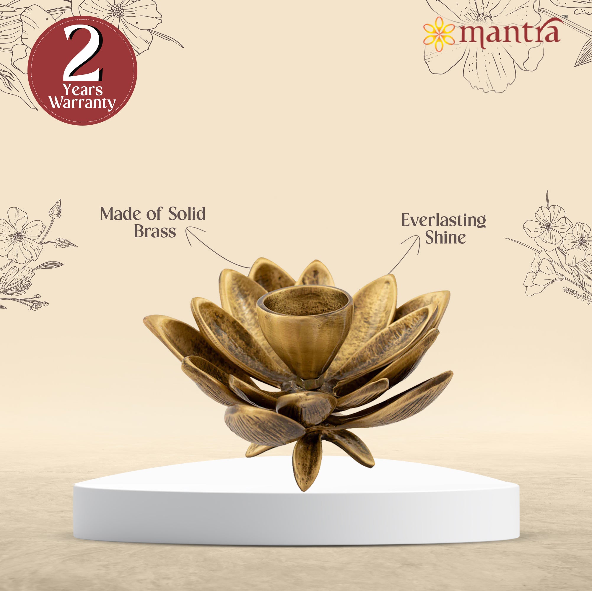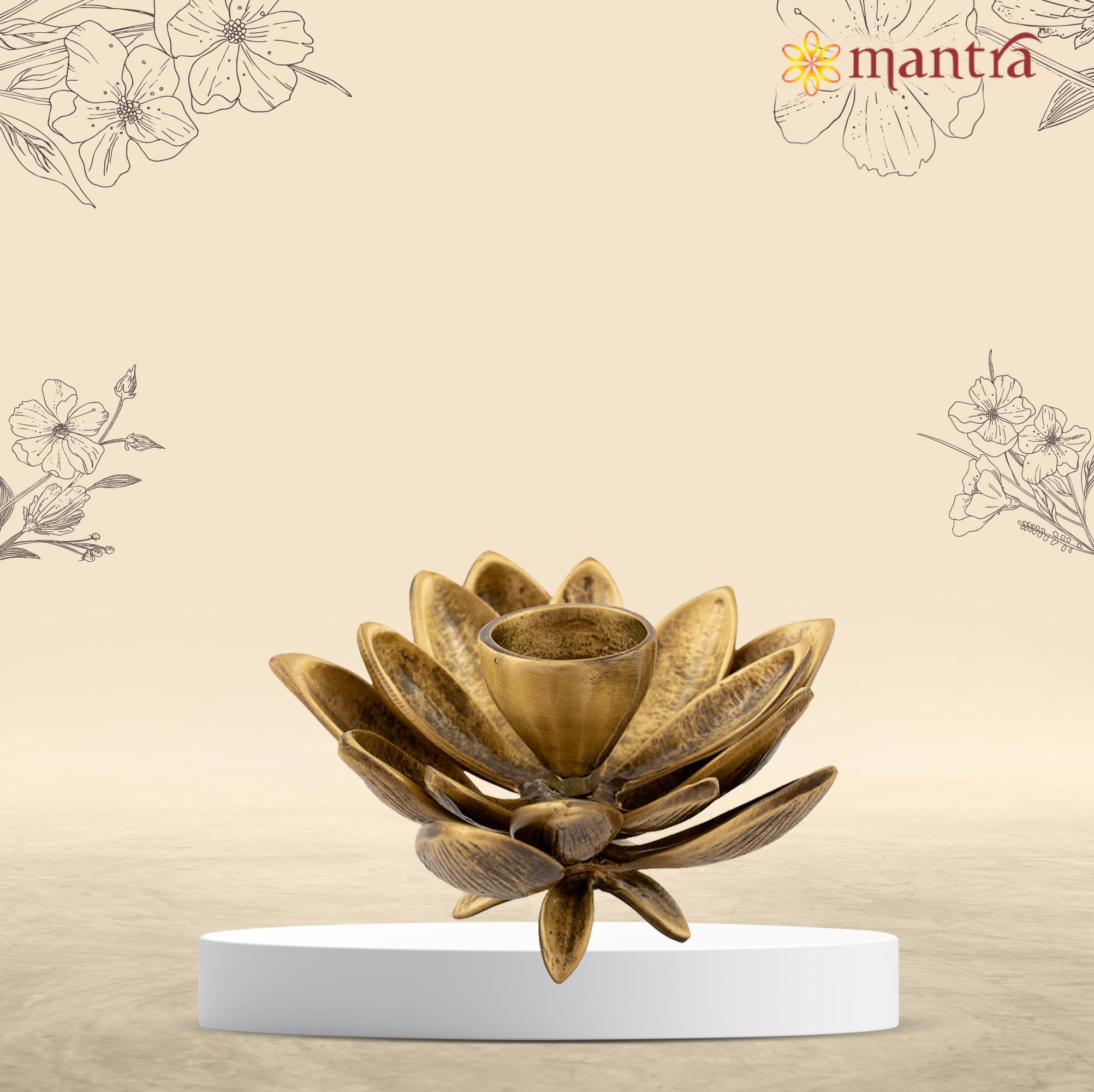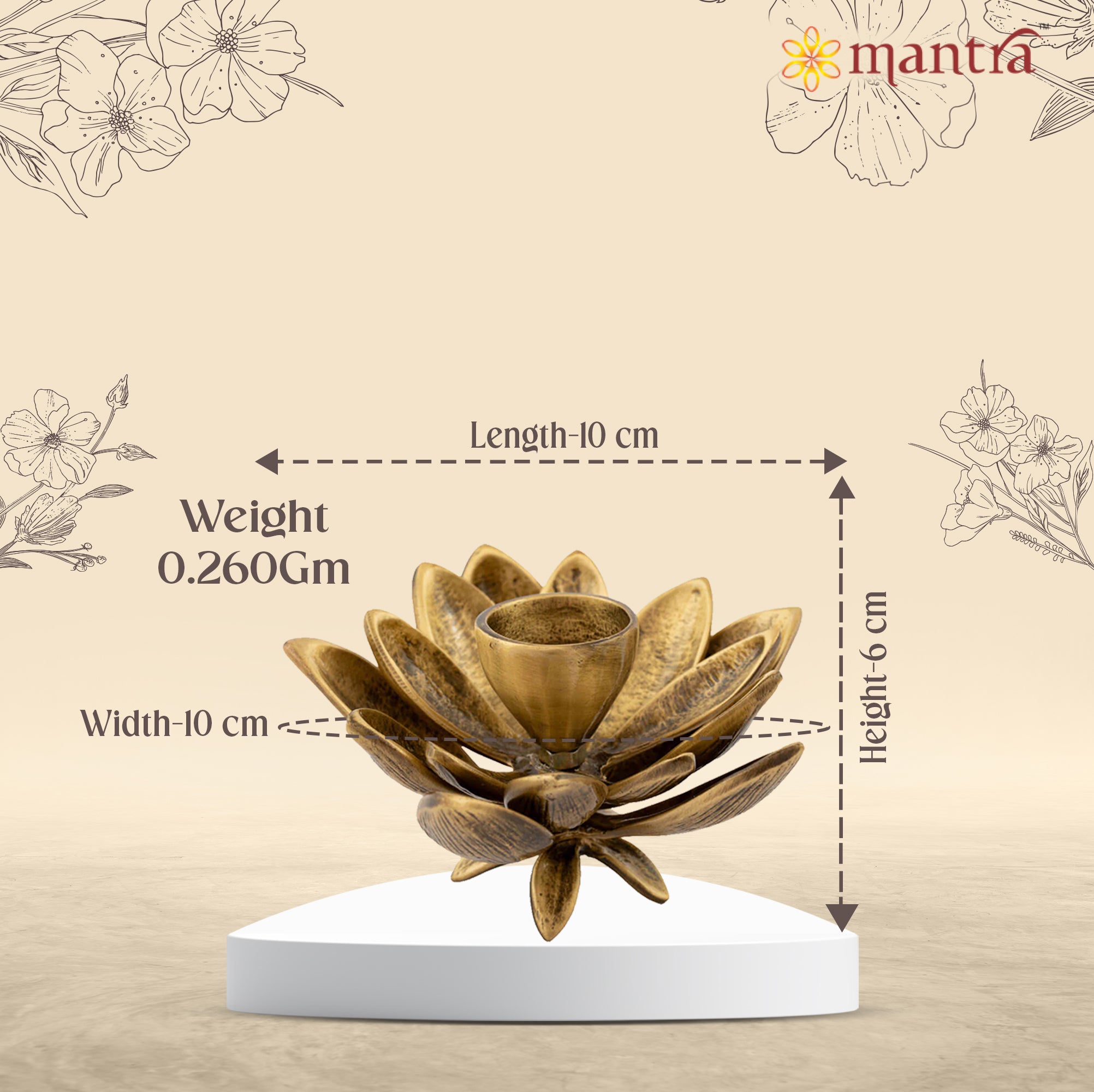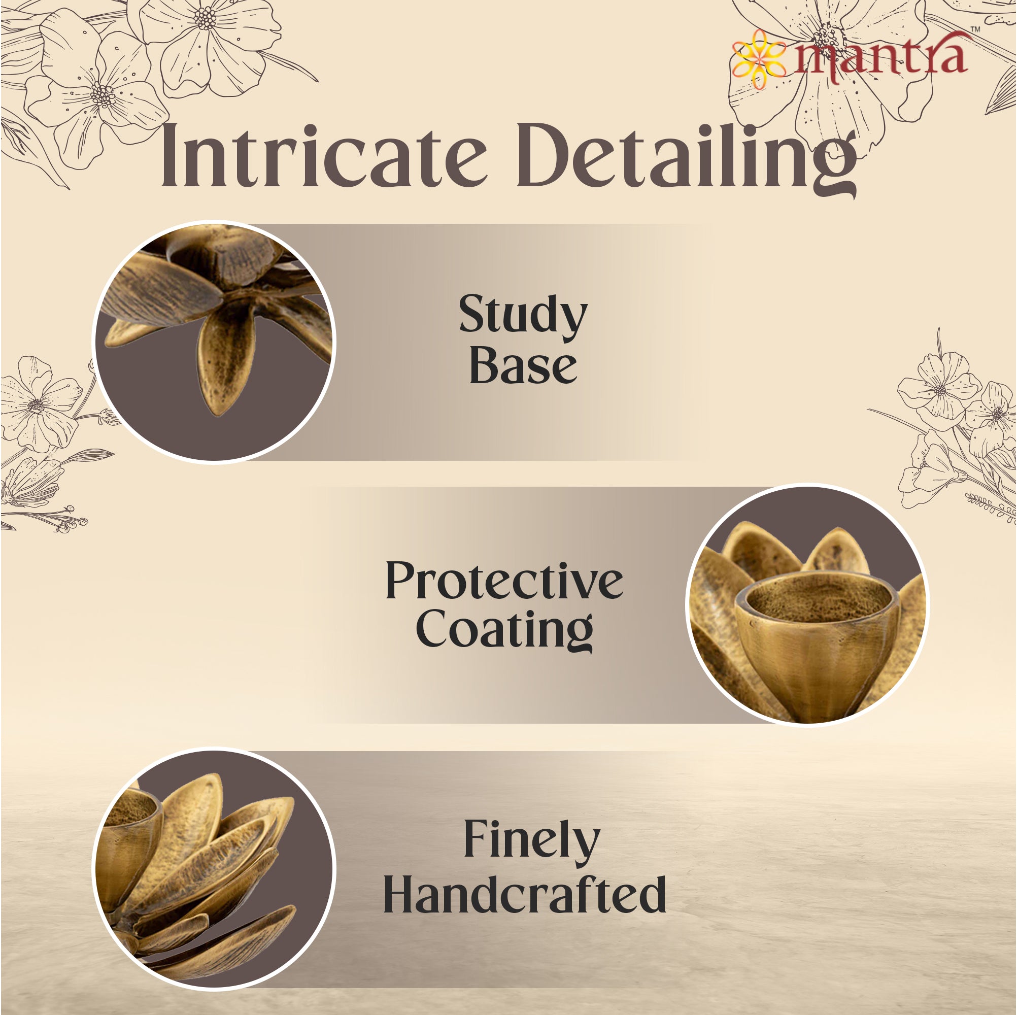 Handcrafted brass candle stand designed as a dainty lotus with a sleek finish. Adding a subtle hint of tradition to the décor they are a soothing addition to any space, and are a sure fire conversation starter. The lotus is a spiritually significant flower in Hinduism and Buddhism that is compared to purity and beauty. The brass and the metals in the finish keep the aura of the room positive and pleasant. They have an aesthetic that goes well with both ethnic and contemporary themes. As a functional part of your décor, they also manipulate the Vasthu of your space, attracting prosperity, and harmony. These stylish candlestands are great for both homes and workspaces.