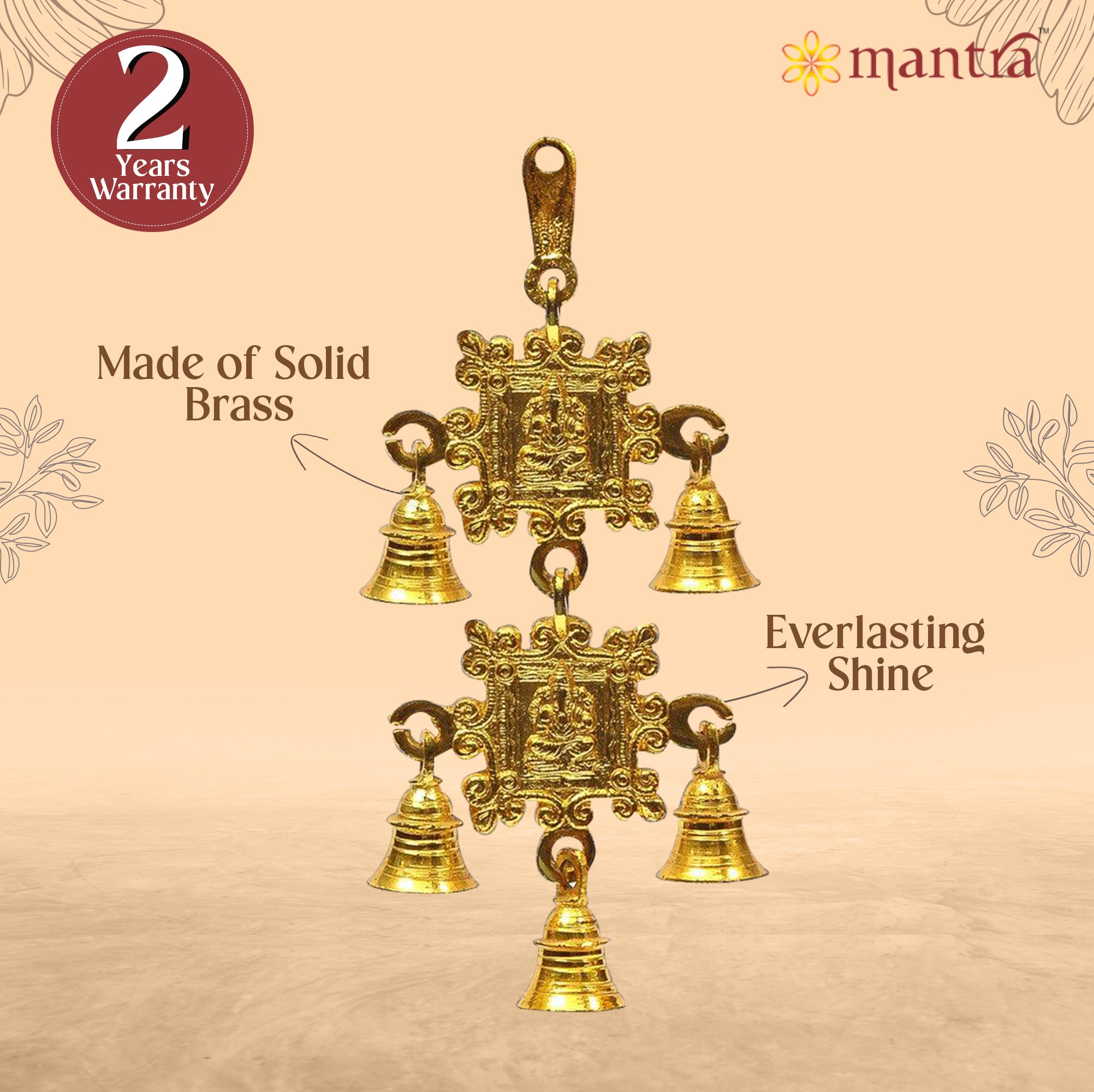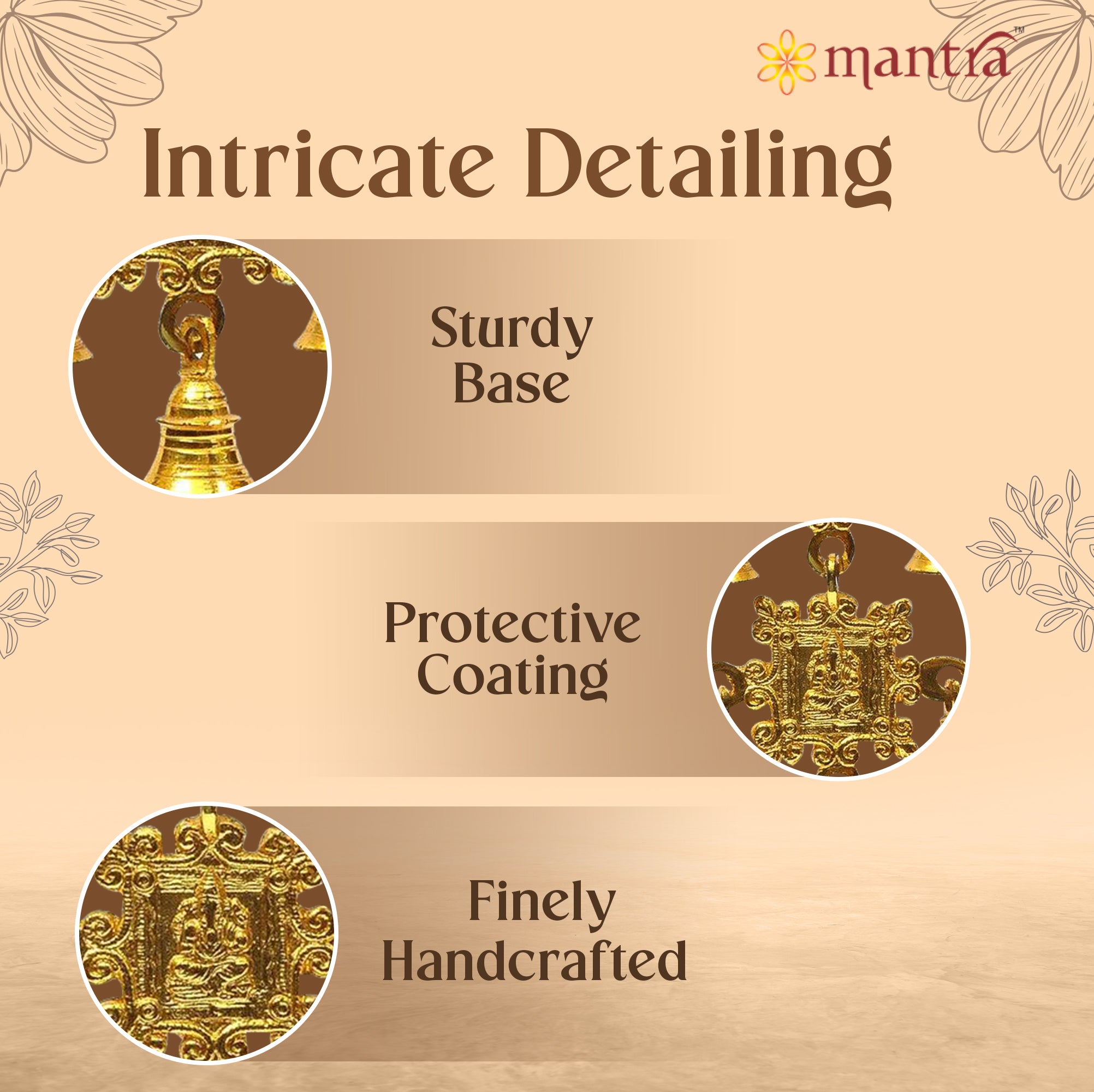 Handcrafted brass wall hanging bell, with 2 tiered Ganesha reliefs. The relief is framed in scrollwork designs. Two bells hang on either side of the reliefs. The Ganesha is richly carved in finery. Ganesha’s presence is auspicious, and the brass fills the home with positive vibrations. The bells produce a pleasing tinkling sound that is easy on the ears. Bells are significant in India, and spirituality, as they are rung during all important ceremonies. The sound of the bells is said to vibrate through the air, cleansing it. This hanging bell, can be hung as Puja room décor, to be rung during Pujas, or become an aesthetic part of your home, as a pleasant alternate to wind chimes.