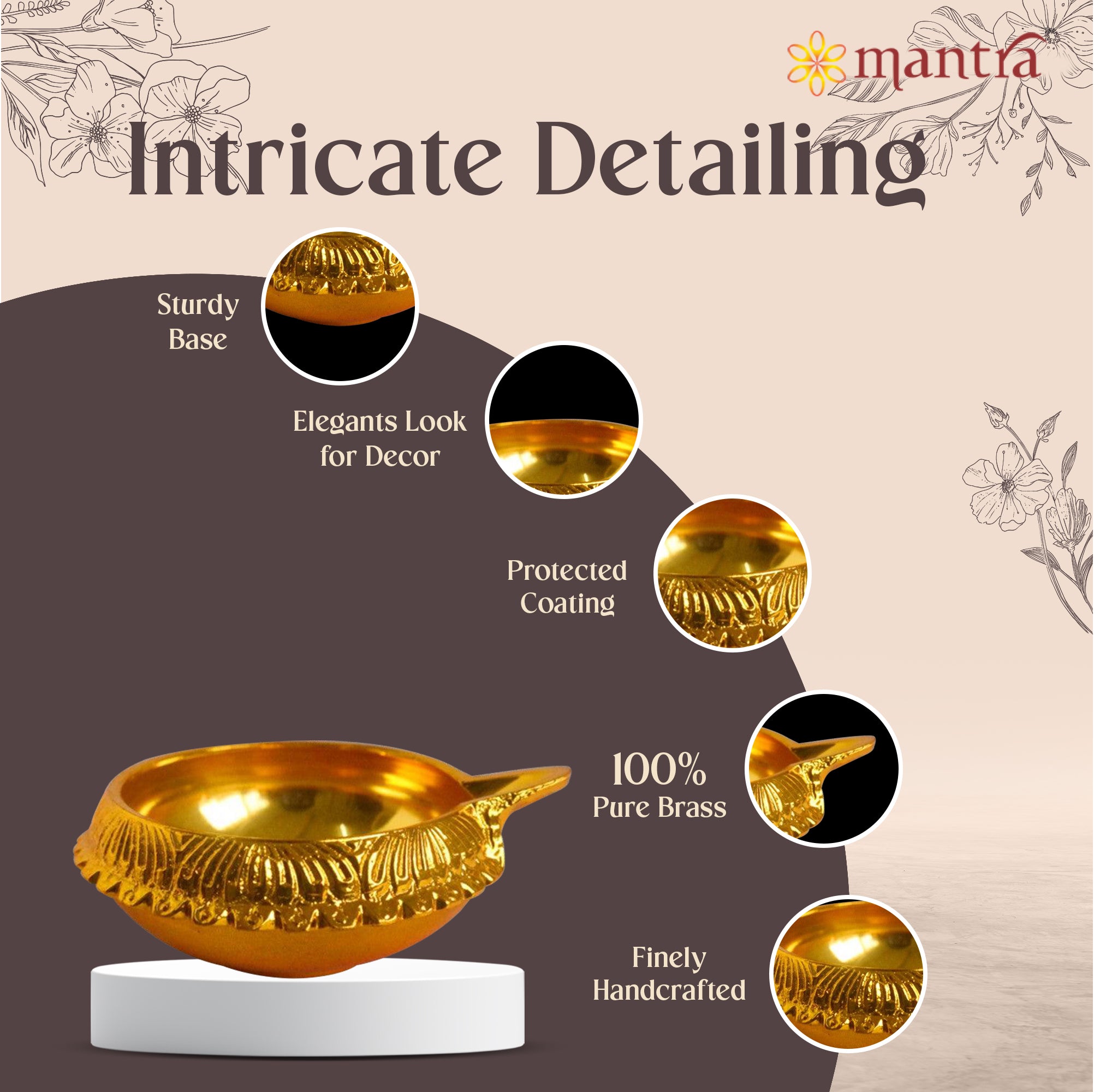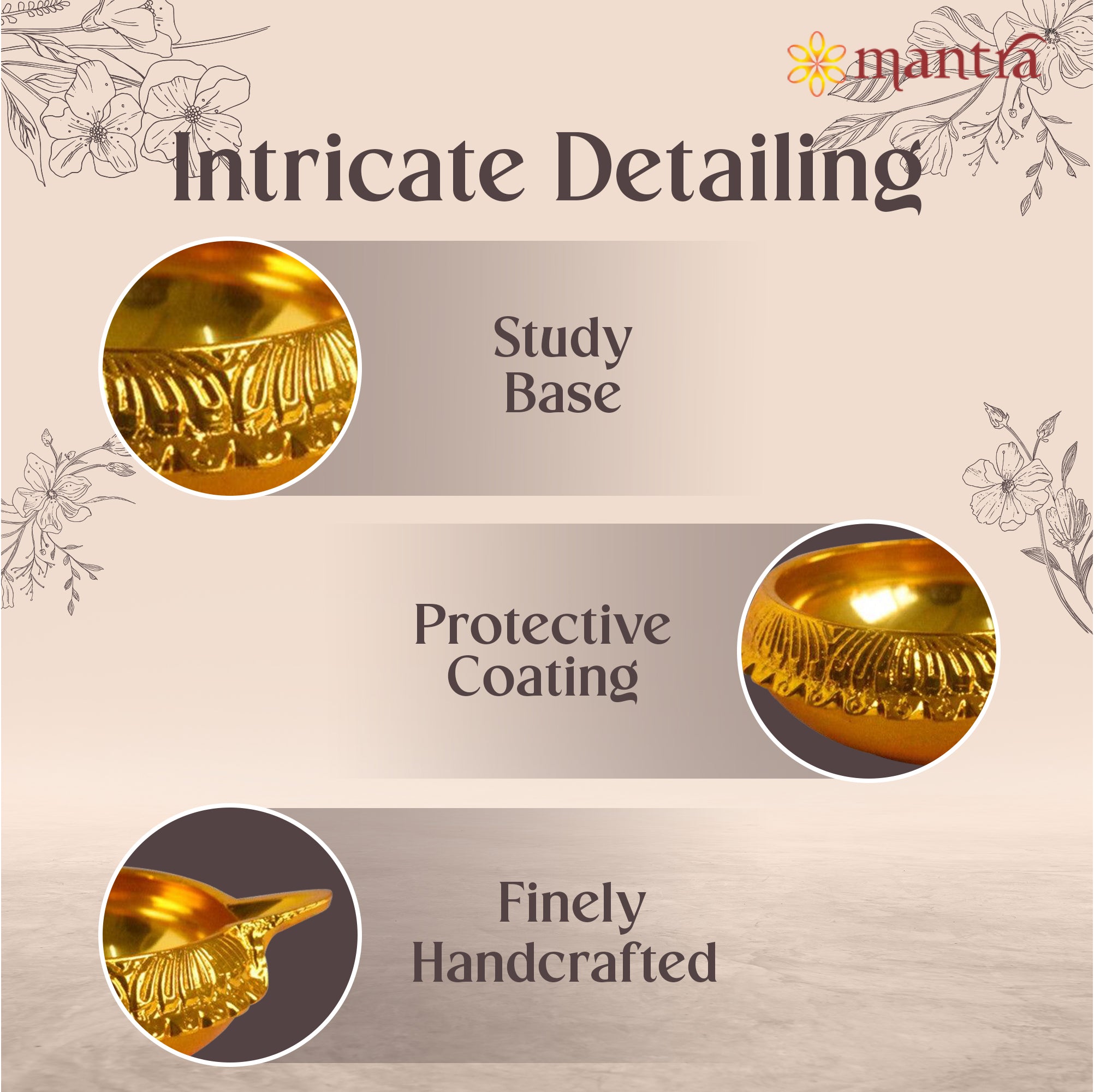 Handcrafted brass Kubera lamp, which is an agal lamp that is carved with flower petal motifs on the rim. Kubera was the God of wealth and the King of the Yakshas. The Kubera lamp is a symbol of luck and prosperity, like the iconic Kubera it was named for. The lamp is crafted from premium brass, and finished in a luxurious Gold Tone. The lamp must be lit twice in the day, in the morning at dawn, and evening at dusk. It can be placed in the Puja room, in the Lamp alcove of the Tulsi maadam, or on either side of the stove in the kitchen. The metals cleanse your space, creating a conducive energy for harmonious living, while its divine light attracts the blessings of the Gods.