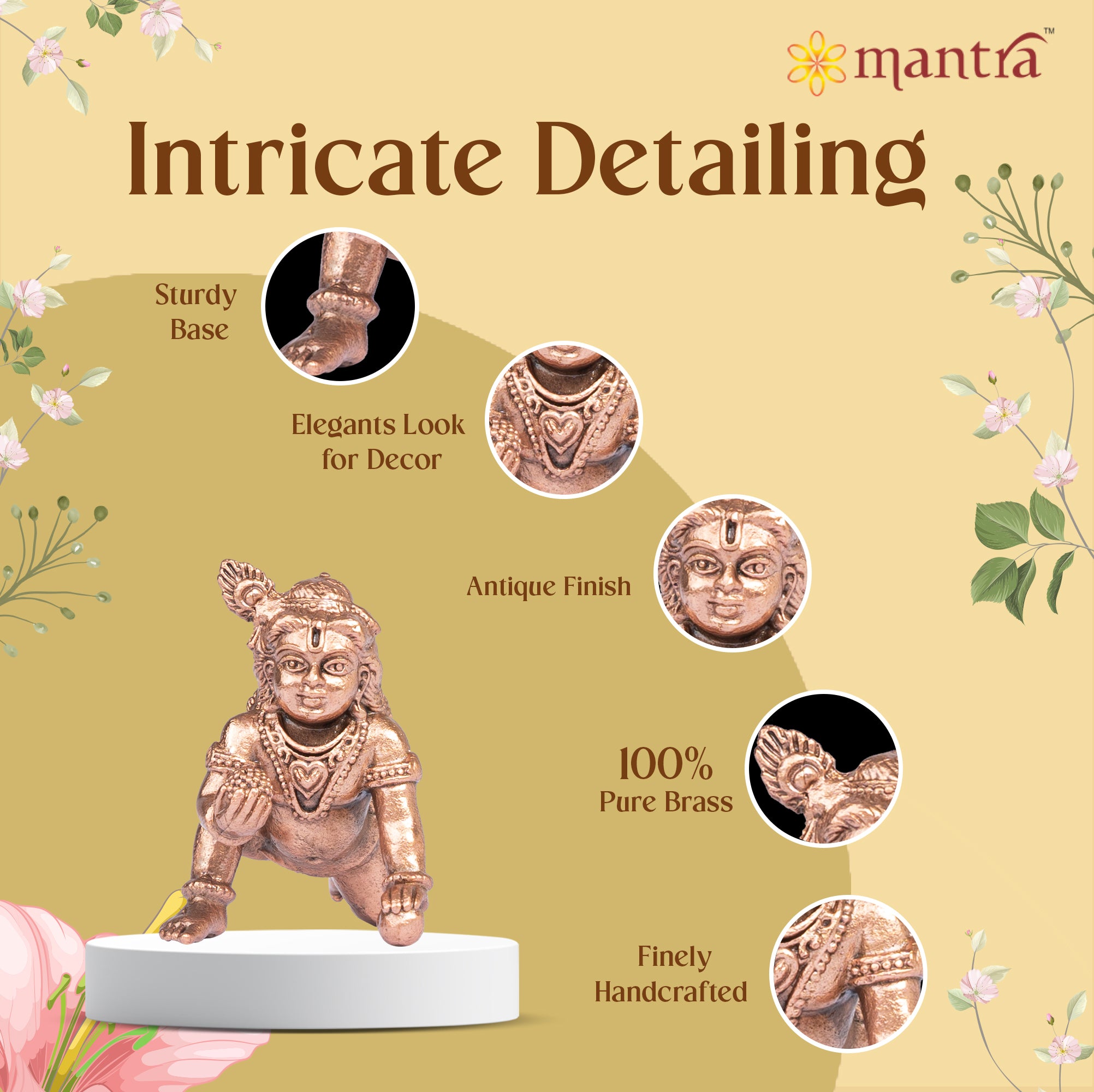 MANTRA DIVIT Crawling Krishna Idol is purely hand-crafted with meticulous attention to detail by expert artisans. The Lacquer finish protects the surface of the idol from dirt, stain or oxidation for years.