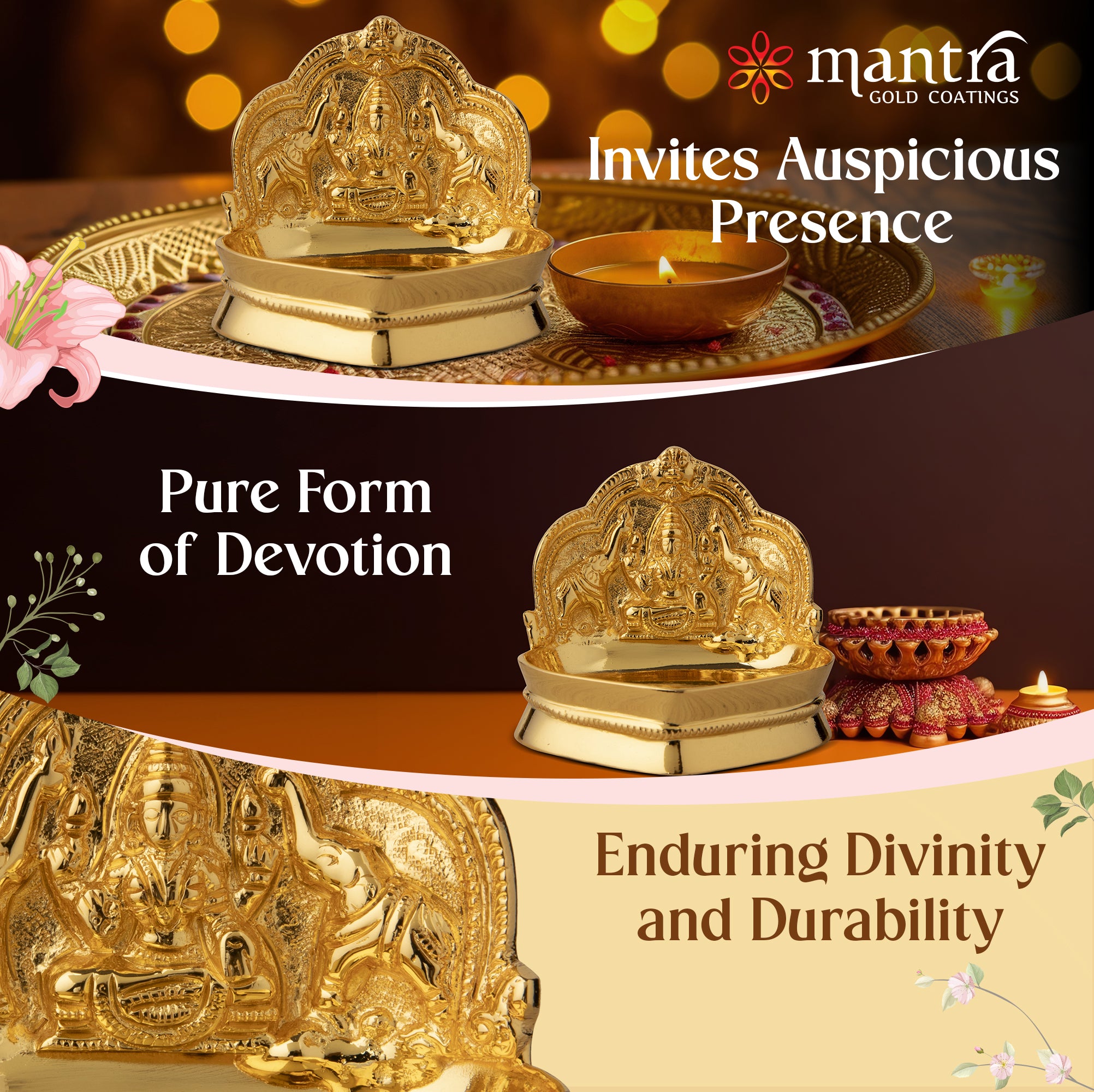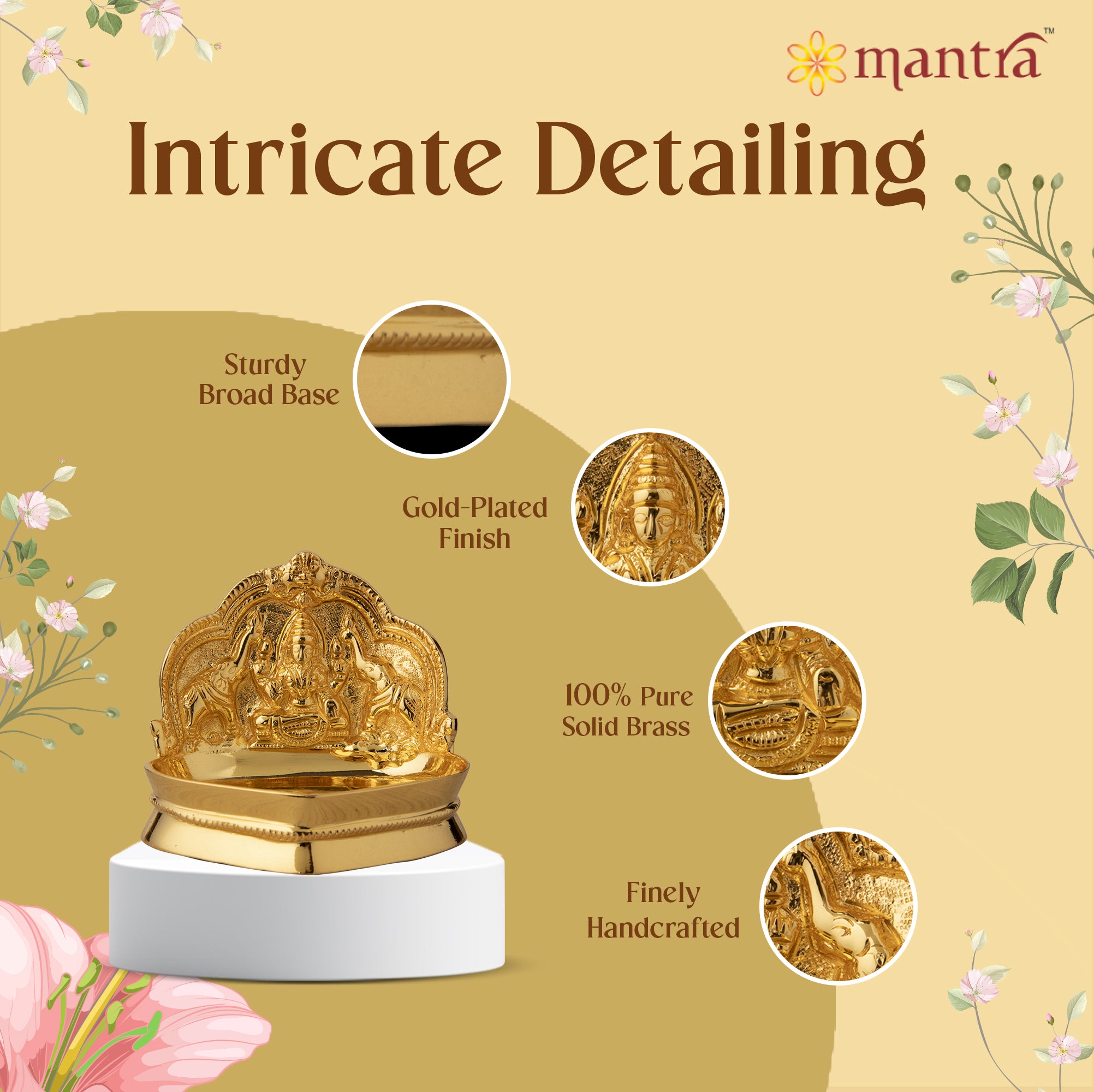 - Peace and protection: Experience long lasting elegance and assured peace of mind with Mantra’s 1-year Gold Plating warranty. The use of high-quality materials in this brass diya ensures durability, a lustrous finish, and resistance to tarnishing.