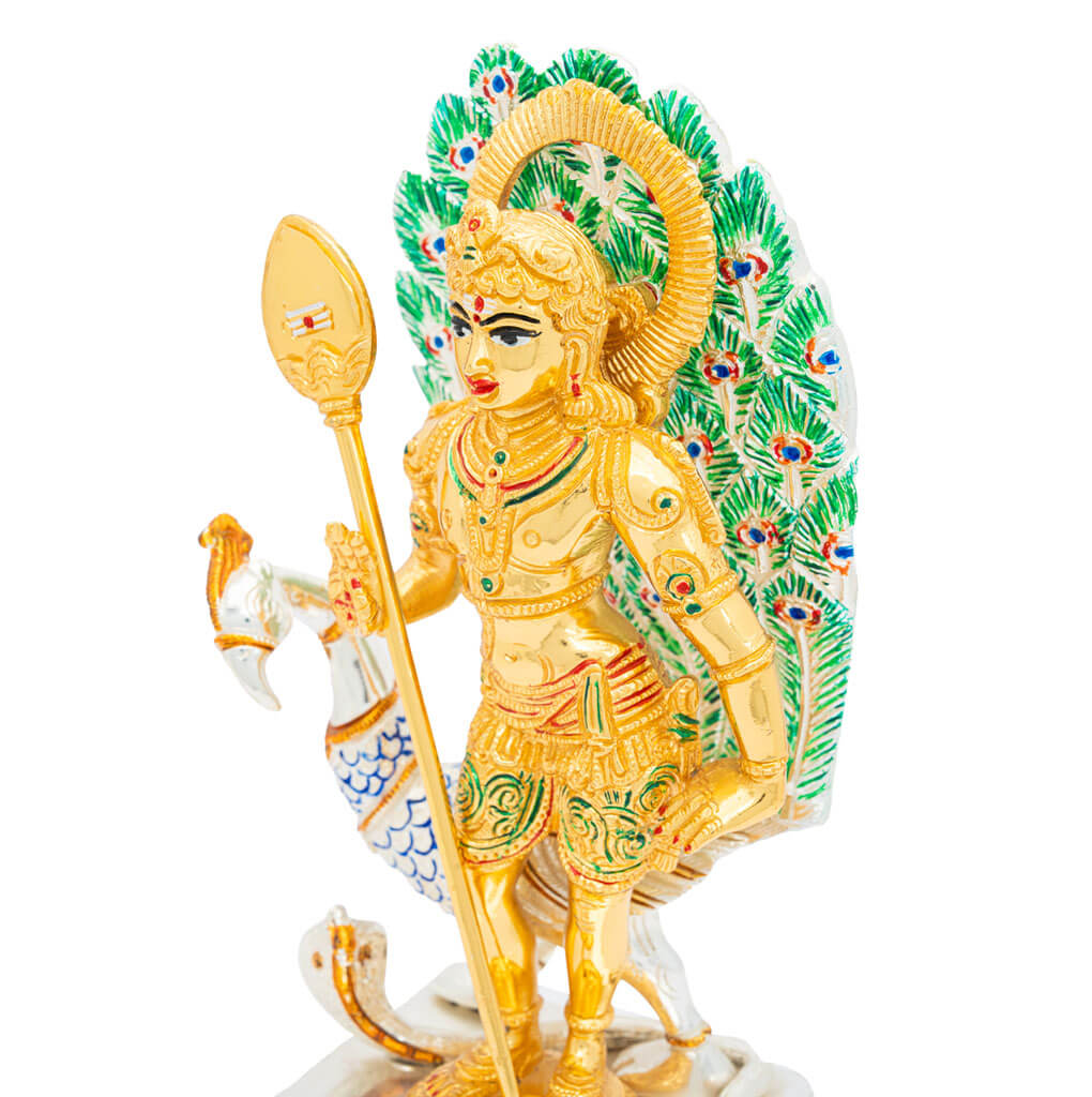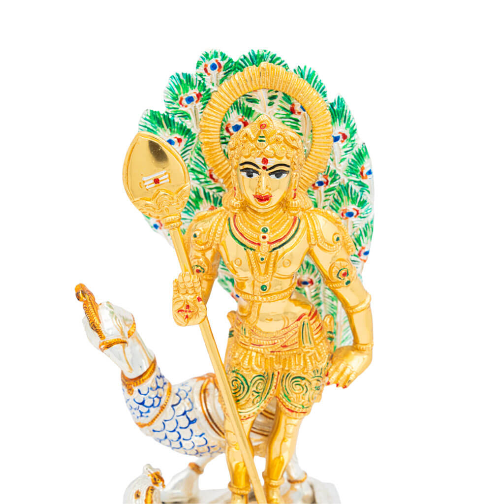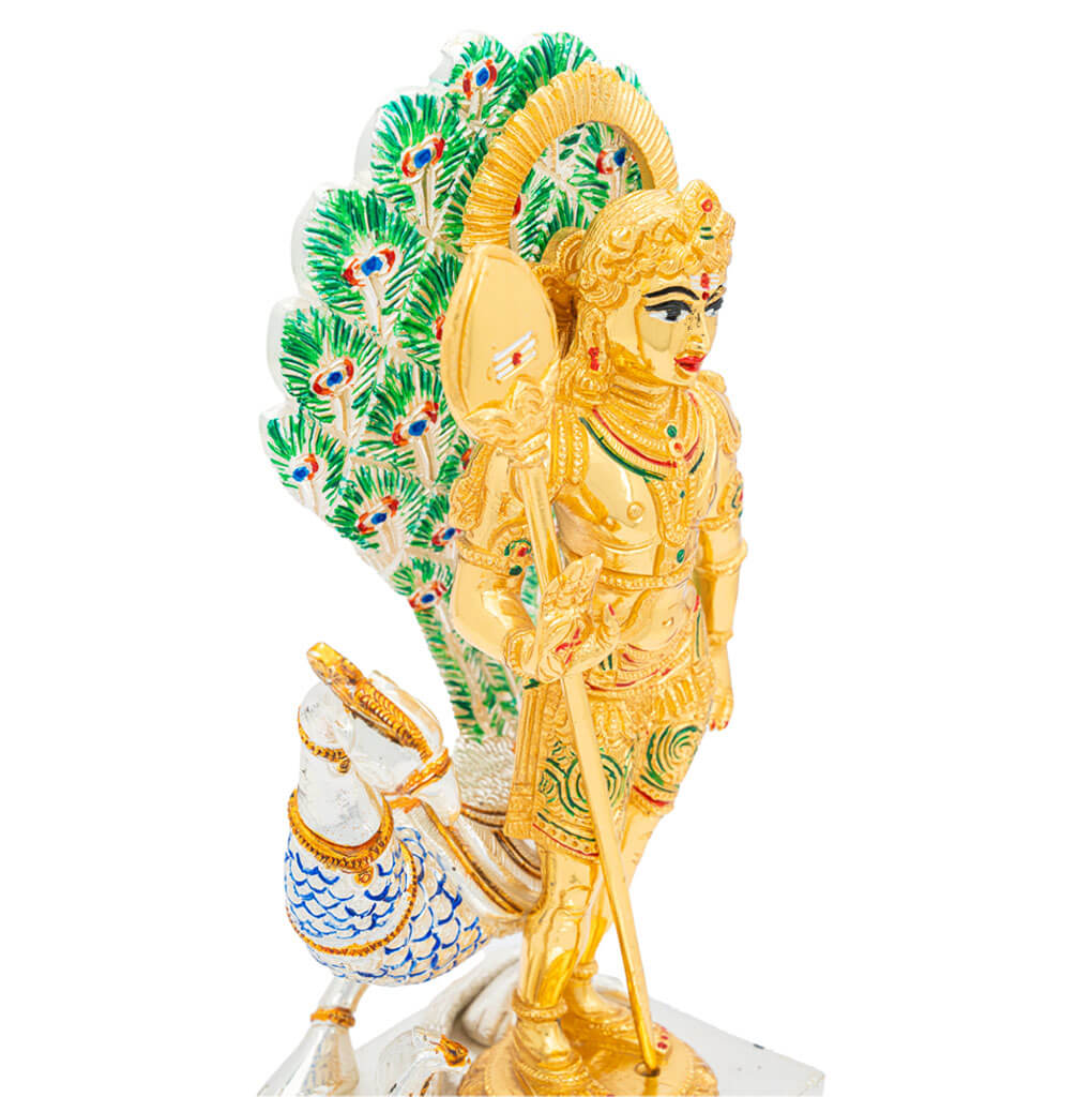 The son of Lord Shiva and Goddess Parvati. Murugan is often depicted holding a spear or vel and riding a peacock.The peacock is believed to symbolise vanity and ego, as it is known for its beautiful and colourful feathers.Lord Murugan's association with the peacock is rich in symbolism, representing the triumph over ego, the vanquishing of demons, and the embodiment of divine virtues.