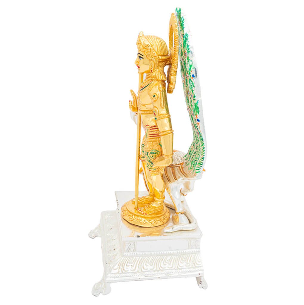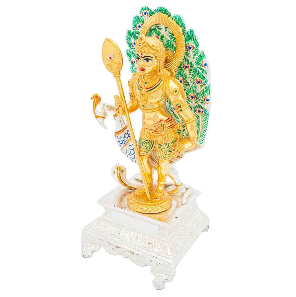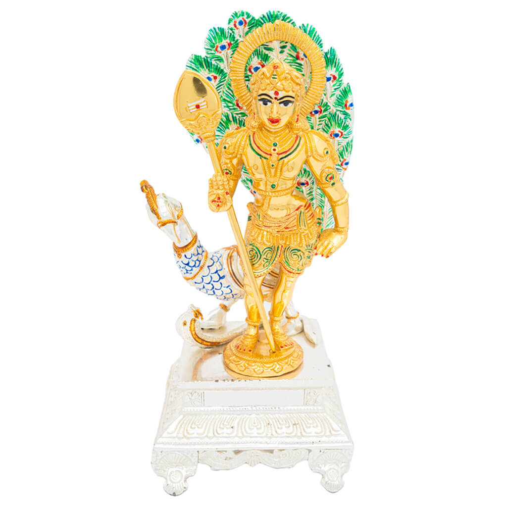 The son of Lord Shiva and Goddess Parvati. Murugan is often depicted holding a spear or vel and riding a peacock.The peacock is believed to symbolise vanity and ego, as it is known for its beautiful and colourful feathers.Lord Murugan's association with the peacock is rich in symbolism, representing the triumph over ego, the vanquishing of demons, and the embodiment of divine virtues.